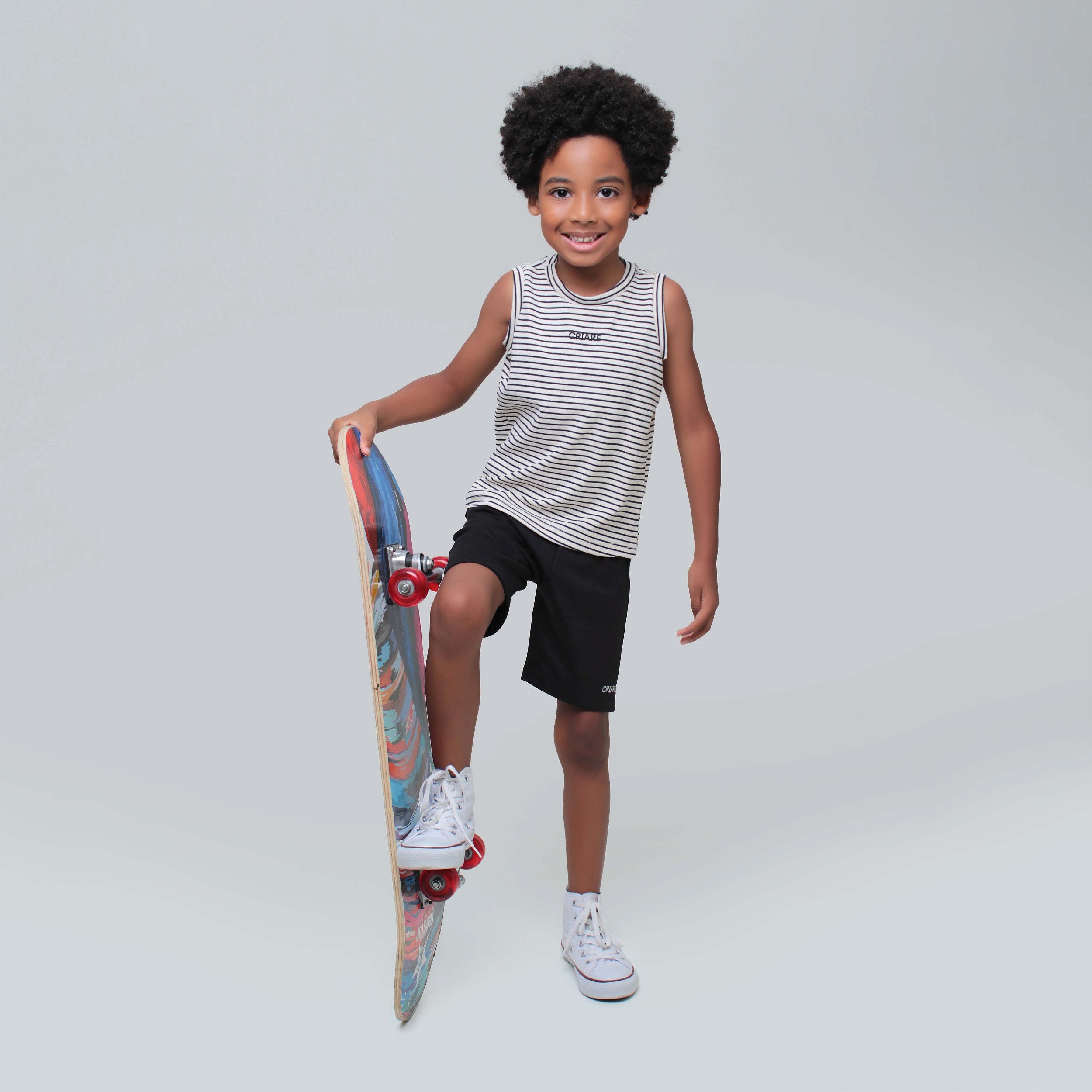 O Conjunto Listras, compõem um shorts em moletinho e uma regata com uma estampa linda de listras.