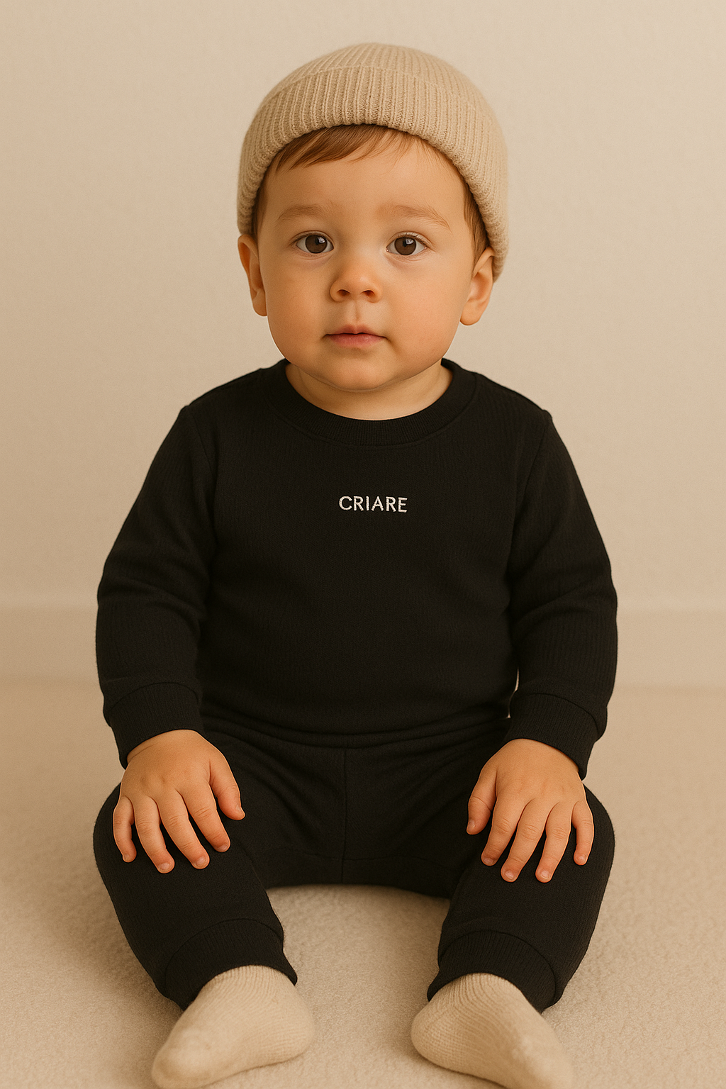 Conjunto básico, em malha canelada 96% algodão e 4% elastano, composto por calça e camiseta manga longa.